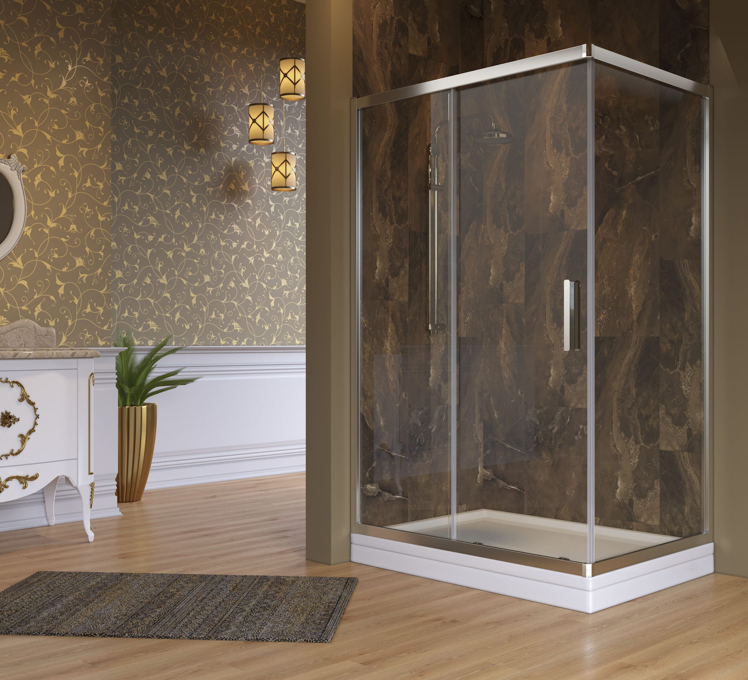 Zemin veya Duş teknesi üzeri uygulanan 2sabit 1kayar, ön cephe girişli 6mm Temper Cam kabin.