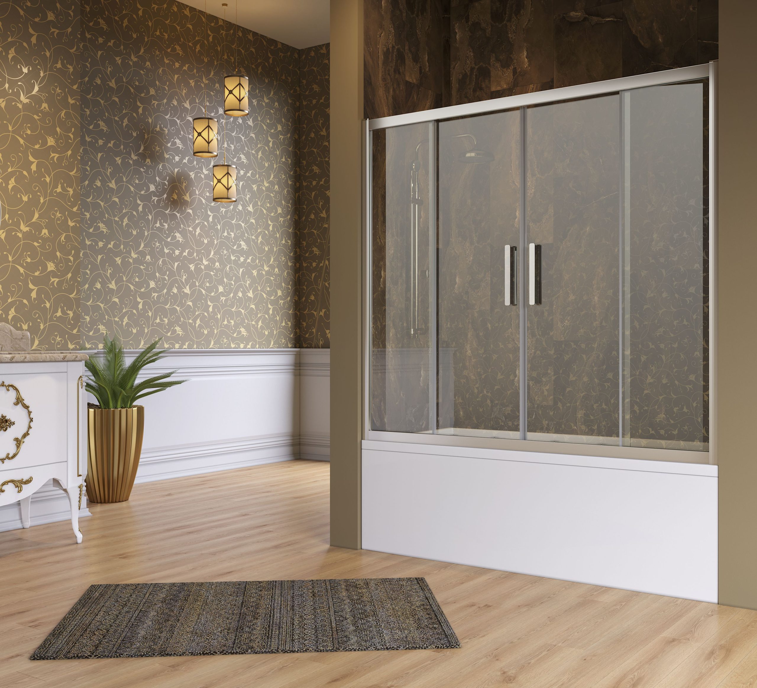Küvet üzeri uygulanan iki duvar arası, 2sabit 2kayar, ön cephe girişli 6mm Temper Cam kabin.